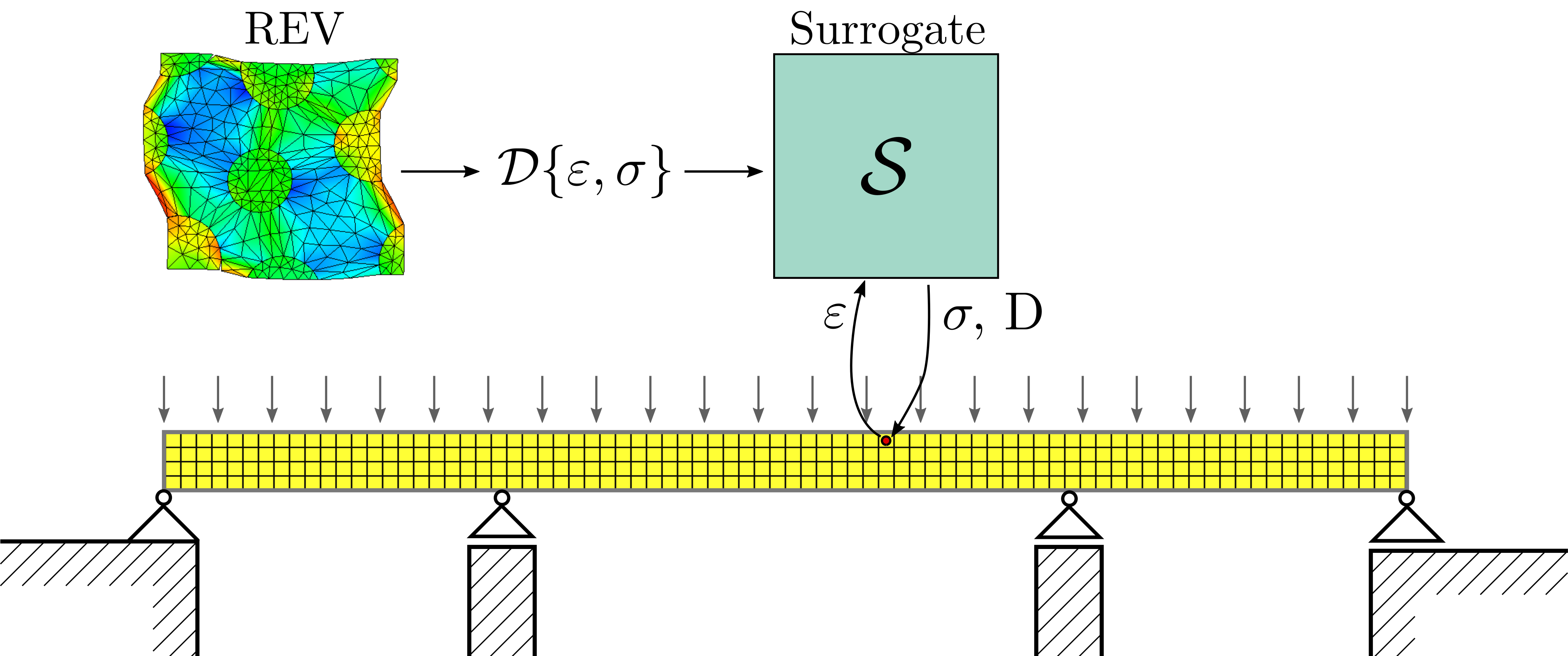 Performing multiscale simulations using FE\(^2\) can be advantageous for the aforementioned reasons. However, simulating the Representative Elementary Volume (REV) for the microscale model is not free, and since it needs to be evaluated many times for any macroscopic simulation, FE\(^2\) can quickly become computationally infeasible. For each macroscopic timestep, REVs can be simulated in parallel to speed this process up, but sometimes this is still insufficient. Then, surrogate models can reduce the computational cost by substituting the REV with a cheaper approximate model.
