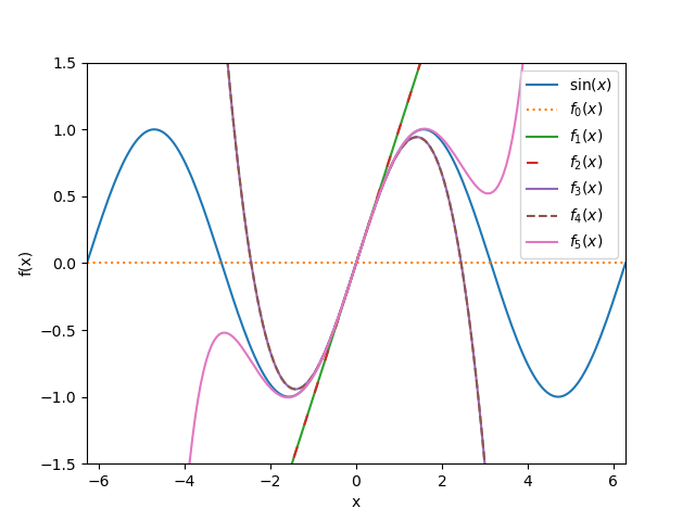 Let’s see how this work in a practical example. We consider here the function \(f(x)=\sin(x)\) and we want to approximate this function knowing the function value and its derivatives at the point \(a=0\). Using five terms in the expansion, \(r=5\), we have that