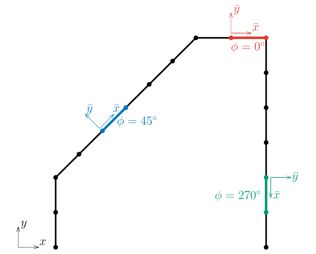 Finally, there is also no need for isoparametric mapping. Shape functions and integration scheme are defined in local coordinate \(\bar{x}\). No mapping between \((\bar{x},\bar{y})\) and \((x,y)\) coordinates is needed, only a transformation of vectors: we have discussed this for displacements, and the same transformation is applied implicitly on forces through the \(\phi\)’s in \(\bB^T\) in the element matrix formalation. A choices needs to be made on where \(\bar{x}\) is defined to be zero. A mapping between \(\bar{x}\in[0,L^e]\) and a local coordinate \(\xi\in[-1,1]\) can be introduced but does bring much benefit.